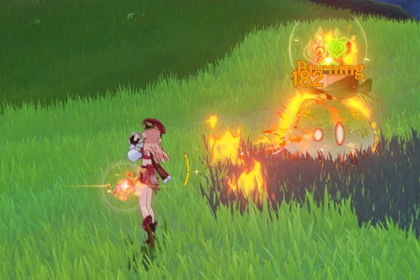 Brûlure (Burning) est une réaction assez simple d'utilisation qui demande simplement d'appliquer Dendro et Pyro. Cette réaction aura pour effet d'allonger la durée de la présence du Pyro sur l'ennemi en plus des dégâts constant qu'elle apporte tant que la Brûlure subsiste. Il est possible de faire subsister la Brûlure en appliquant seulement plus de Dendro sans nécessairement utiliser à nouveau du Pyro.